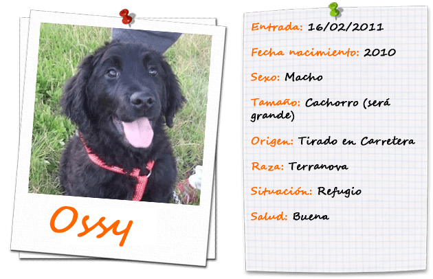 Allí estaba el coche… paró un momento, el suficiente para abrir la puerta y tirarle en medio de un charco. Ossy creyó que se trataba de un juego. Pero no. Así, sin más, le soltaron con 2 meses de vida. Empapado y tiritando. Lo recogieron, lo llevaron al veterinario, y ahora aquí está… esta preciosidad aún cachorrito busca su hogar. Es muy simpático, juguetón. Se lleva bien con todos. Amigo de los gatos.