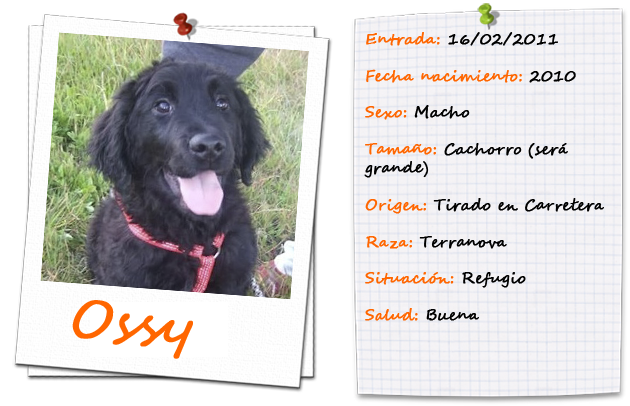 Allí estaba el coche… paró un momento, el suficiente para abrir la puerta y tirarle en medio de un charco. Ossy creyó que se trataba de un juego. Pero no. Así, sin más, le soltaron con 2 meses de vida. Empapado y tiritando. Lo recogieron, lo llevaron al veterinario, y ahora aquí está… esta preciosidad aún cachorrito busca su hogar. Es muy simpático, juguetón. Se lleva bien con todos. Amigo de los gatos.