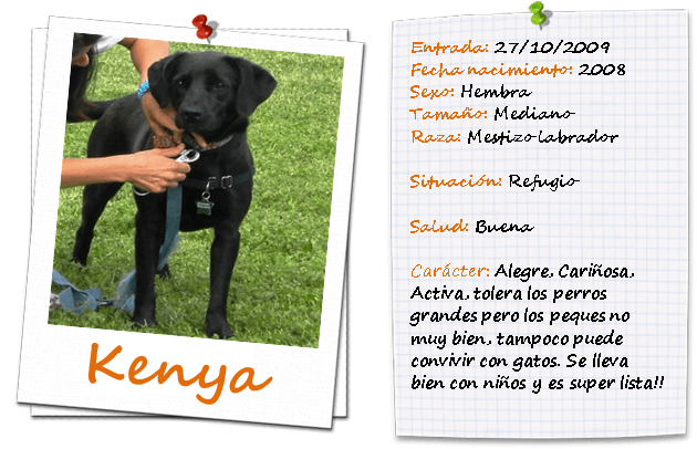 Kenya fue abandonada, no sabemos de su historia pasada sólo que acabó en una perrera horrible de las tantas que hay en nuestro país. Además parió en ese infierno, sólo uno de sus cachorritos sobrevivió, él enseguida encontró casita pero ella aún sigue esperándola. Han salido muchas casas para ella pero todas tienen gatos, y ella por desgracia no puede convivir con gatos. Pero seguro que en algún lado se encuentra esa casita que tanto se merece, verdad? Es ideal para vivir en un piso, es medianita y suuuuuuuuper lista! Y le encantan los perros grandes con los quien jugar!!