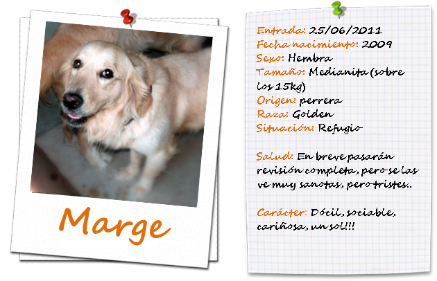Marge es la mami de Lisa, ambas fueron abandonadas en una horrible perrera. Y estaban en lista de sacrificio inminente. Por suerte, pudimos rescatarlas a tiempo! Pero lo han pasado muy mal, sobretodo Marge que fue separada de Lisa en otra jaula. Está muy triste, depresiva más bien.. aunque vamos a intentar por todos los medios que recupere las ganas de vivir.
