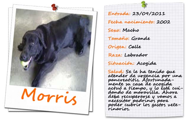 Morris está por suerte en una casa de acogida! decimos por suerte sobretodo porque su estado de salud no era muy bueno, y afortunadamente la familia de acogida le ha atendido estupendamente. Morris sufre de pancreatitis, debido a su mala vida anterior. Pero, esa vida ya la ha dejado atrás y ahora sólo hay esperanza, cariño, cuidados y muuuuuuucha vida. Necesitamos padrinos para poder sufragar sus gastos veterinarios. Os animáis?
