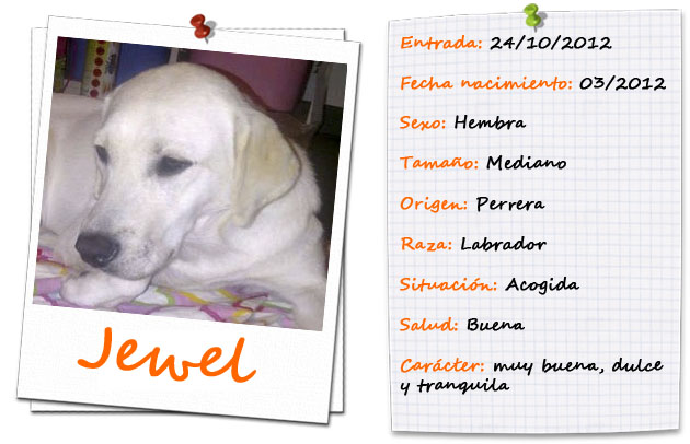 Jewel estaba en una perrera, con fecha programada… Por suerte pudimos sacarla a tiempo. Es una perra joven maravillosa, muy buena y muy dulce.