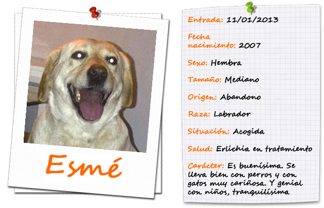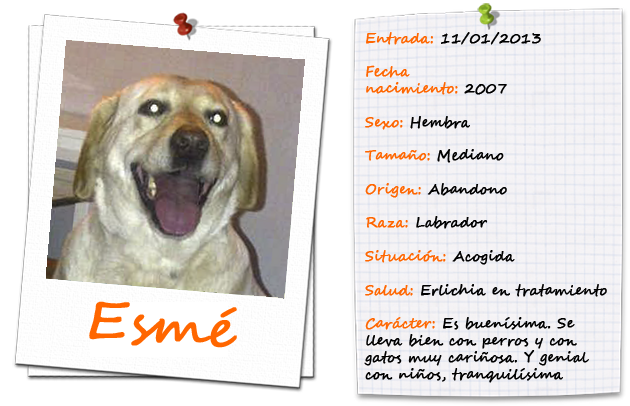 ¡ADOPTADA! ESMÉ, LA HERMANITA DE RENÉE Publicado el 11 enero 201324 enero 2013 por Sosgolden Su historia Rescatada junto a su hermana Renée de una finca donde convivía con más perros, ellas eran les peor paradas ya que todos las atacaban, por suerte ya están fuera de allí, son buenísimas, conviven perfectamente con niños, perros y gatos. Fotos Compartir: Haz clic para enviar un enlace por correo electrónico a un amigo (Se abre en una ventana nueva) Correo electrónico Haz clic para compartir en Facebook (Se abre en una ventana nueva) Facebook Haz clic para compartir en X (Se abre en una ventana nueva) X Haz clic para compartir en Pinterest (Se abre en una ventana nueva) Pinterest Me gusta Cargando...