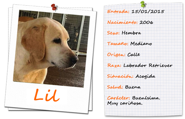 Lil fue encontrada en una horrible situación, rodeada de basura y con dos cachorritos muertos. Afortunadamente fue rescatada y ahora se encuentra en acogida, donde se ha recuperado de manera extraordinaria después de una cirugía para extraerle un tumor del recto. Es una perra buenísima, tranquila y sociable. Aun tiene algunos problemas de incontinencia como secuela de la cirugía, por lo que sería ideal una casa con jardín. Necesita con urgencia una nueva acogida o adopción para que no tenga que ir al refugio. Para ello Lil también forma parte de nuestra campaña ADOPTA UN SENIOR para que pueda disfrutar de un hogar indefinidamente. Si quieres aogerla o adoptarla escríbenos a sosgolden@gmail.com ACTUALIZACIÓN 25 MARZO 2015 Estamos pendientes de realizar más pruebas para valorar la salud de LIL. La última revisión veterinaria valoró unos posibles tumores en el colon. Así que vamos a realizar un TAC para asegurarnos de su estado de salud y valorar así posible tratamiento.