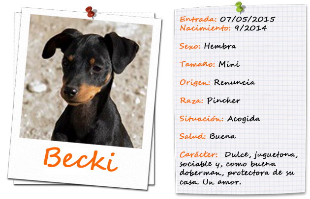 Becki es una Doberman Pincher muy cariñosa. Es una cachorrita muy lista, su peso no superará los 4 kg. Muy sociable con niños y gatos.