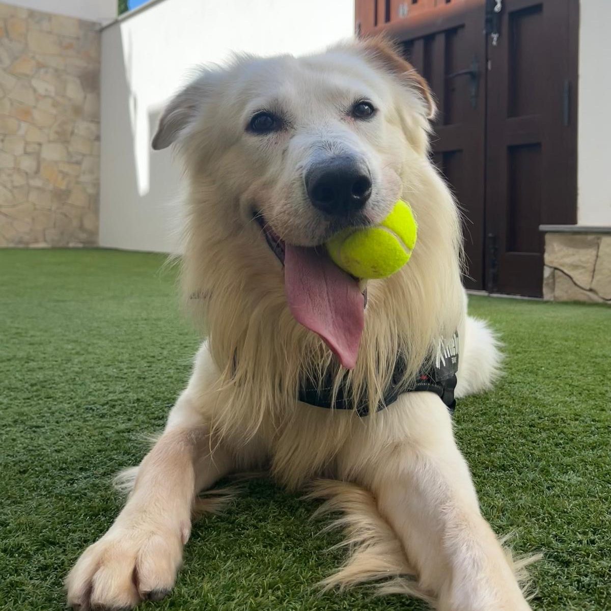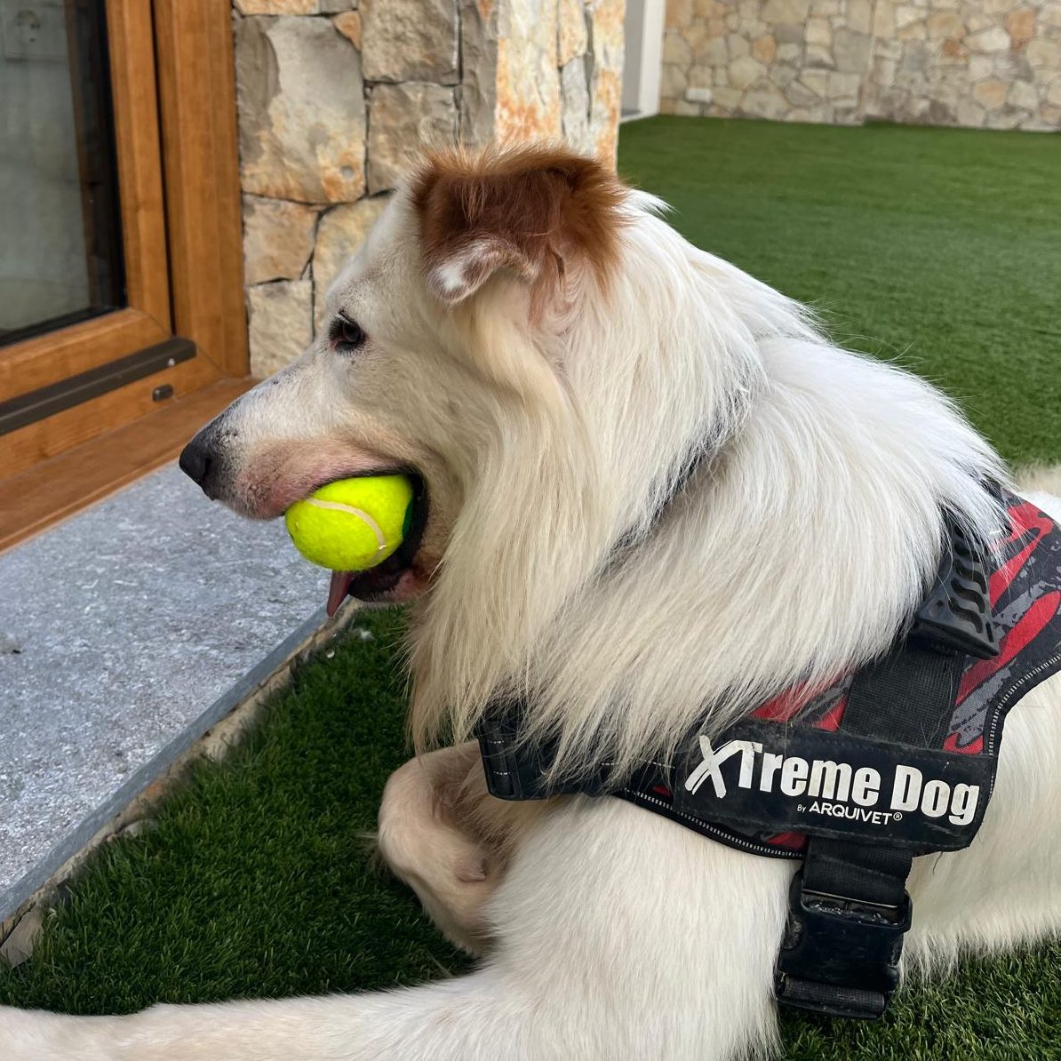 Tiene un nivel de estrés muy alto por todo lo que ha pasado y hay que trabajar la reducción de estrés. Por eso también cuando sale de casa tira bastante de la correa. Al poco rato ya pasea mejor. Hay que tener en cuenta que es un perro joven y con fuerza.